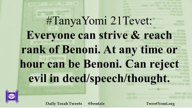 #TanyaYomi 21Tevet: Everyone can strive & reach rank of Benoni. At any time or hour can be Benoni. Can reject evil in deed/speech/thought.