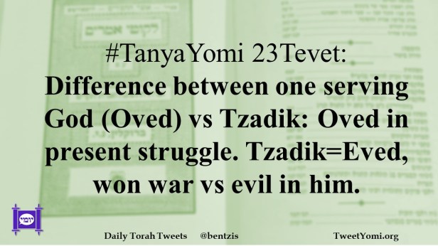 #TanyaYomi 23Tevet: Difference between one serving God (Oved) vs Tzadik: Oved in present struggle. Tzadik=Eved, won war vs evil in him.