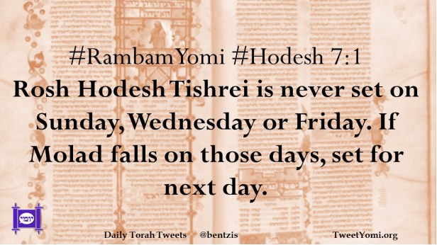#RambamYomi #Hodesh 7:1 Rosh Hodesh Tishrei is never set on Sunday, Wednesday or Friday. If Molad falls on those days, set for next day.