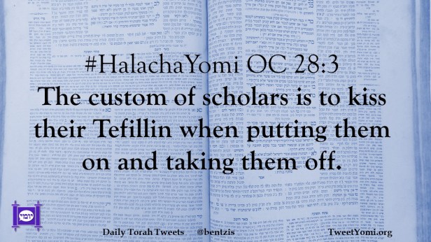 HalachaYomi #HalachaYomi OC 28:3 Date: March 1, 2021Author: ysspitz #HalachaYomi OC 28:3 The custom of scholars is to kiss their Tefillin when putting them on and taking them off. Share this: Share on X (Opens in new window) X Share on Facebook (Opens in new window) Facebook Like Loading... Related