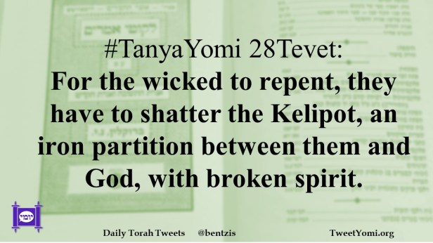 #TanyaYomi 28Tevet: For the wicked to repent, they have to shatter the Kelipot, an iron partition between them and God, with broken spirit.
