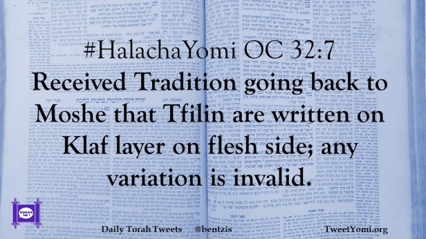 #HalachaYomi OC 32:7 Received Tradition going back to Moshe that Tfilin are written on Klaf layer on flesh side; any variation is invalid.