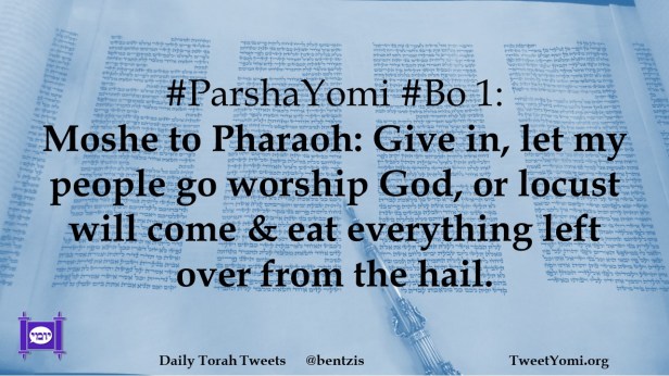 #ParshaYomi #Bo 1: Moshe to Pharaoh: Give in, let my people go worship God, or locust will come & eat everything left over from the hail.