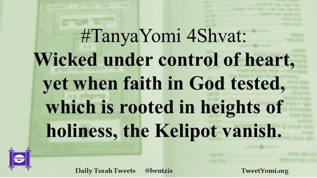 #TanyaYomi 4Shvat: Wicked under control of heart, yet when faith in God tested, which is rooted in heights of holiness, the Kelipot vanish.
