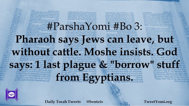 #ParshaYomi #Bo 3: Pharaoh says Jews can leave, but without cattle. Moshe insists. God says: 1 last plague & “borrow” stuff from Egyptians.