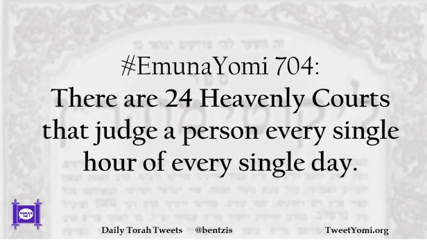 EmunaYomi #EmunaYomi 704 Date: March 11, 2021Author: ysspitz #EmunaYomi 704: There are 24 Heavenly Courts that judge a person every single hour of every single day. Share this: Share on X (Opens in new window) X Share on Facebook (Opens in new window) Facebook Like Loading... Related