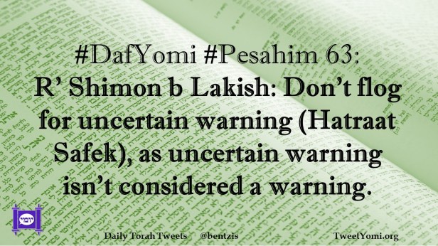 DafYomi, Pesahim #DafYomi #Pesahim 63 Date: March 14, 2021Author: ysspitz #DafYomi #Pesahim 63: R’ Shimon b Lakish: Don’t flog for uncertain warning (Hatraat Safek), as uncertain warning isn’t considered a warning. Share this: Share on X (Opens in new window) X Share on Facebook (Opens in new window) Facebook Like Loading... Related