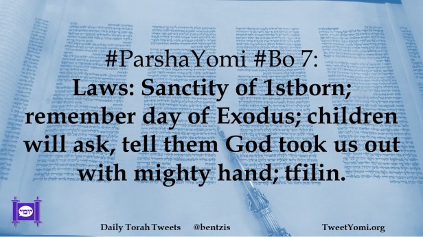 #ParshaYomi #Bo 7: Laws: Sanctity of 1stborn; remember day of Exodus; children will ask, tell them God took us out with mighty hand; tfilin.