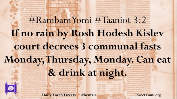#RambamYomi #Taaniot 3:2 If no rain by Rosh Hodesh Kislev court decrees 3 communal fasts Monday, Thursday, Monday. Can eat & drink at night.