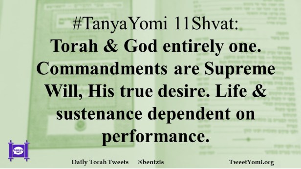 #TanyaYomi 11Shvat: Torah & God entirely one. Commandments are Supreme Will, His true desire. Life & sustenance dependent on performance.