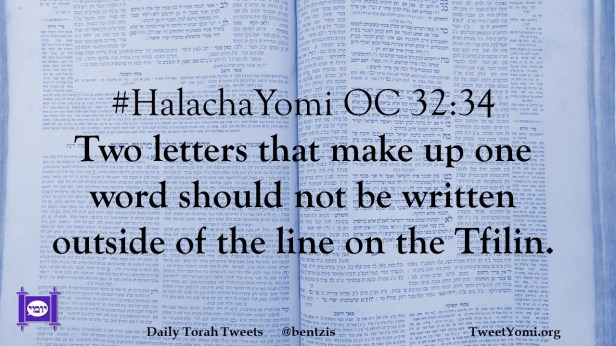 HalachaYomi #HalachaYomi OC 32:34 Date: March 18, 2021Author: ysspitz #HalachaYomi OC 32:34 Two letters that make up one word should not be written outside of the line on the Tfilin. Share this: Share on X (Opens in new window) X Share on Facebook (Opens in new window) Facebook Like Loading... Related