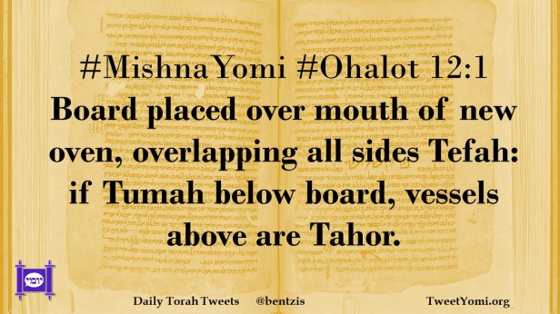 #MishnaYomi #Ohalot 12:1 Board placed over mouth of new oven, overlapping all sides Tefah: if Tumah below board, vessels above are Tahor.