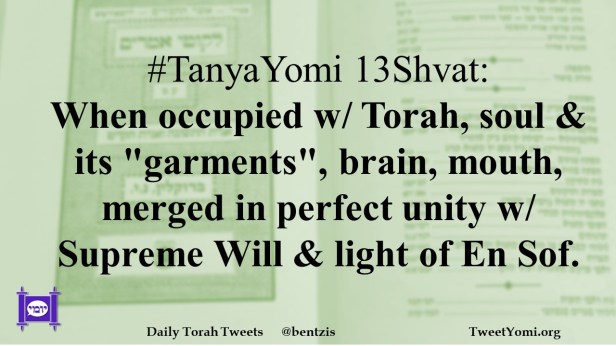#TanyaYomi 13Shvat: When occupied w/ Torah, soul & its “garments”, brain, mouth, merged in perfect unity w/ Supreme Will & light of En Sof.