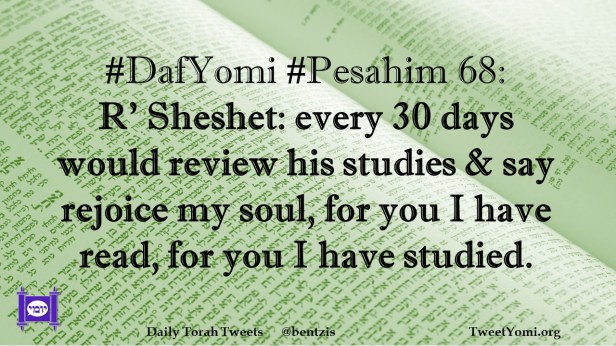 DafYomi, Pesahim #DafYomi #Pesahim 68 Date: April 5, 2021Author: ysspitz #DafYomi #Pesahim 68: R’ Sheshet: every 30 days would review his studies & say rejoice my soul, for you I have read, for you I have studied. Share this: Share on X (Opens in new window) X Share on Facebook (Opens in new window) Facebook Like Loading... Related