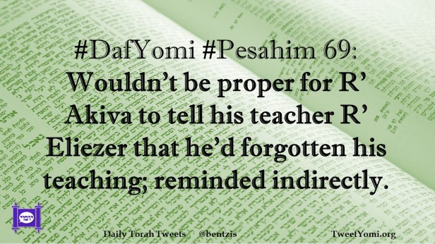 DafYomi, Pesahim #DafYomi #Pesahim 69 Date: April 5, 2021Author: ysspitz #DafYomi #Pesahim 69: Wouldn’t be proper for R’ Akiva to tell his teacher R’ Eliezer that he’d forgotten his teaching; reminded indirectly. Share this: Share on X (Opens in new window) X Share on Facebook (Opens in new window) Facebook Like Loading... Related