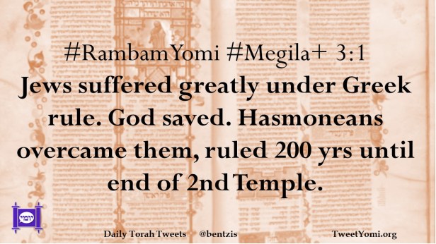 #RambamYomi #Megila+ 3:1 Jews suffered greatly under Greek rule. God saved. Hasmoneans overcame them, ruled 200 yrs until end of 2nd Temple.