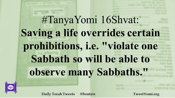#TanyaYomi 16Shvat: Saving a life overrides certain prohibitions, i.e. “violate one Sabbath so will be able to observe many Sabbaths.”