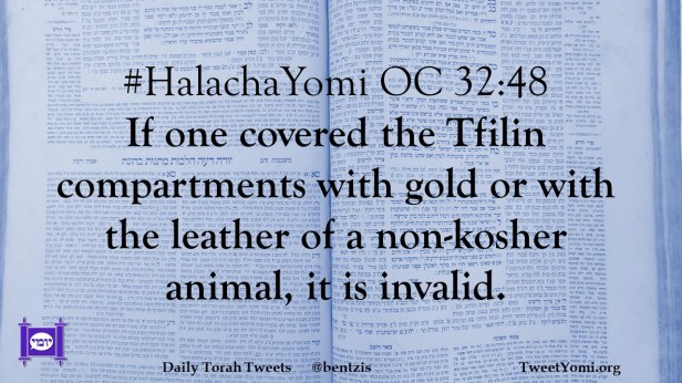 #HalachaYomi OC 32:48 If one covered the Tfilin compartments with gold or with the leather of a non-kosher animal, it is invalid.