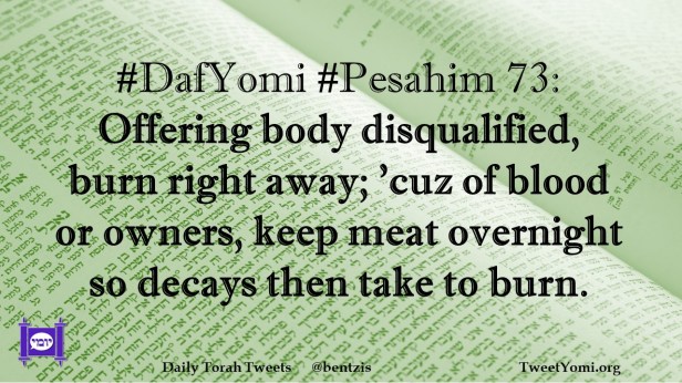 DafYomi, Pesahim #DafYomi #Pesahim 73 Date: April 11, 2021Author: ysspitz #DafYomi #Pesahim 73: Offering body disqualified, burn right away; ‘cuz of blood or owners, keep meat overnight so decays then take to burn. Share this: Share on X (Opens in new window) X Share on Facebook (Opens in new window) Facebook Like Loading... Related