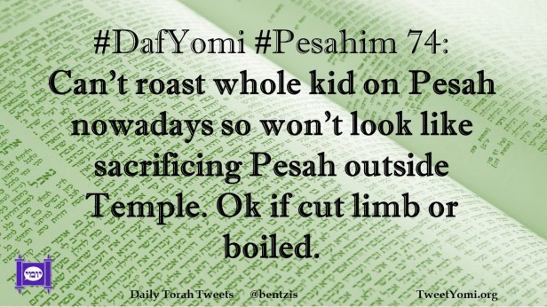 DafYomi, Pesahim #DafYomi #Pesahim 74 Date: April 11, 2021Author: ysspitz #DafYomi #Pesahim 74: Can’t roast whole kid on Pesah nowadays so won’t look like sacrificing Pesah outside Temple. Ok if cut limb or boiled. Share this: Share on X (Opens in new window) X Share on Facebook (Opens in new window) Facebook Like Loading... Related