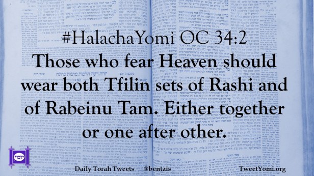 #HalachaYomi OC 34:2 Those who fear Heaven should wear both Tfilin sets of Rashi and of Rabeinu Tam. Either together or one after other.