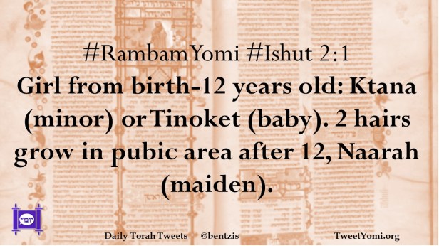 #RambamYomi #Ishut 2:1 Girl from birth-12 years old: Ktana (minor) or Tinoket (baby). 2 hairs grow in pubic area after 12, Naarah (maiden).