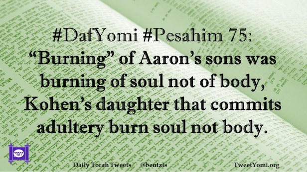 DafYomi, Pesahim #DafYomi #Pesahim 75 Date: April 12, 2021Author: ysspitz #DafYomi #Pesahim 75: “Burning” of Aaron’s sons was burning of soul not of body, Kohen’s daughter that commits adultery burn soul not body. Share this: Share on X (Opens in new window) X Share on Facebook (Opens in new window) Facebook Like Loading... Related