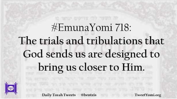 EmunaYomi #EmunaYomi 718 Date: April 12, 2021Author: ysspitz #EmunaYomi 718: The trials and tribulations that God sends us are designed to bring us closer to Him. Share this: Share on X (Opens in new window) X Share on Facebook (Opens in new window) Facebook Like Loading... Related