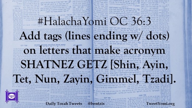 #HalachaYomi OC 36:3 Add tags (lines ending w/ dots) on letters that make acronym SHATNEZ GETZ [Shin, Ayin, Tet, Nun, Zayin, Gimmel, Tzadi].