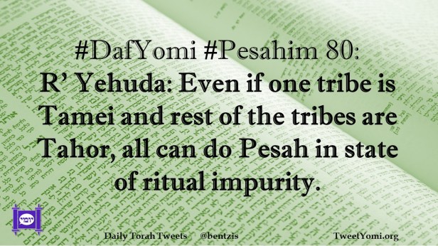DafYomi, Pesahim #DafYomi #Pesahim 80 Date: April 16, 2021Author: ysspitz #DafYomi #Pesahim 80: R’ Yehuda: Even if one tribe is Tamei and rest of the tribes are Tahor, all can do Pesah in state of ritual impurity. Share this: Share on X (Opens in new window) X Share on Facebook (Opens in new window) Facebook Like Loading... Related