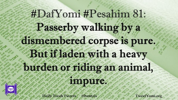 DafYomi, Pesahim #DafYomi #Pesahim 81 Date: April 16, 2021Author: ysspitz #DafYomi #Pesahim 81: Passerby walking by a dismembered corpse is pure. But if laden with a heavy burden or riding an animal, impure. Share this: Share on X (Opens in new window) X Share on Facebook (Opens in new window) Facebook Like Loading... Related