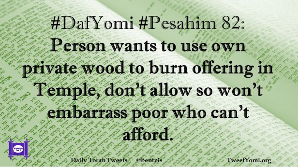 DafYomi, Pesahim #DafYomi #Pesahim 82 Date: April 16, 2021Author: ysspitz #DafYomi #Pesahim 82: Person wants to use own private wood to burn offering in Temple, don’t allow so won’t embarrass poor who can’t afford. Share this: Share on X (Opens in new window) X Share on Facebook (Opens in new window) Facebook Like Loading... Related