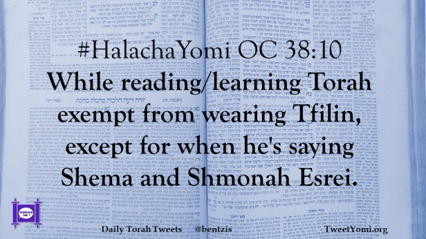 #HalachaYomi OC 38:10 While reading/learning Torah exempt from wearing Tfilin, except for when he’s saying Shema and Shmonah Esrei.
