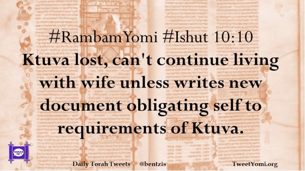 #RambamYomi #Ishut 10:10 Ktuva lost, can’t continue living with wife unless writes new document obligating self to requirements of Ktuva.