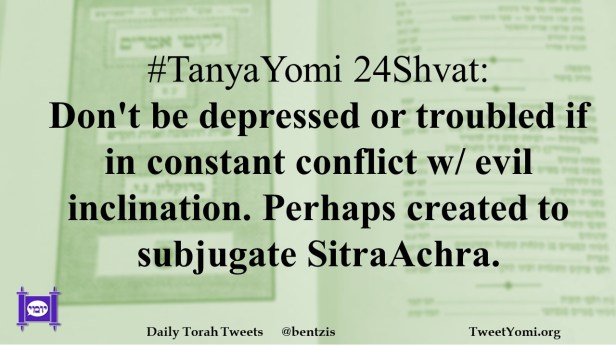 #TanyaYomi 24Shvat: Don’t be depressed or troubled if in constant conflict w/ evil inclination. Perhaps created to subjugate SitraAchra.