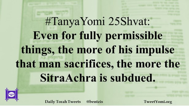 #TanyaYomi 25Shvat: Even for fully permissible things, the more of his impulse that man sacrifices, the more the SitraAchra is subdued.