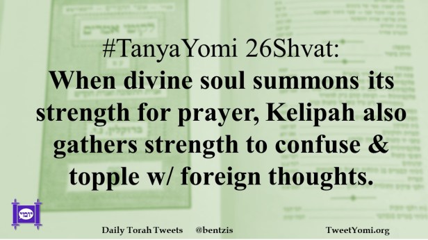 #TanyaYomi 26Shvat: When divine soul summons its strength for prayer, Kelipah also gathers strength to confuse & topple w/ foreign thoughts.