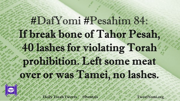 DafYomi, Pesahim #DafYomi #Pesahim 84 Date: April 18, 2021Author: ysspitz #DafYomi #Pesahim 84: If break bone of Tahor Pesah, 40 lashes for violating Torah prohibition. Left some meat over or was Tamei, no lashes. Share this: Share on X (Opens in new window) X Share on Facebook (Opens in new window) Facebook Like Loading... Related
