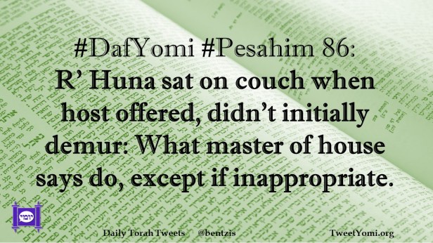 DafYomi, Pesahim #DafYomi #Pesahim 86 Date: April 20, 2021Author: ysspitz #DafYomi #Pesahim 86: R’ Huna sat on couch when host offered, didn’t initially demur: What master of house says do, except if inappropriate. Share this: Share on X (Opens in new window) X Share on Facebook (Opens in new window) Facebook Like Loading... Related