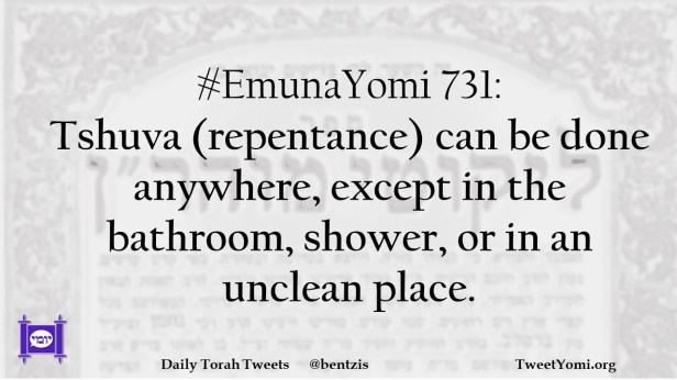 EmunaYomi #EmunaYomi 731 Date: April 20, 2021Author: ysspitz #EmunaYomi 731: Tshuva (repentance) can be done anywhere, except in the bathroom, shower, or in an unclean place. Share this: Share on X (Opens in new window) X Share on Facebook (Opens in new window) Facebook Like Loading... Related