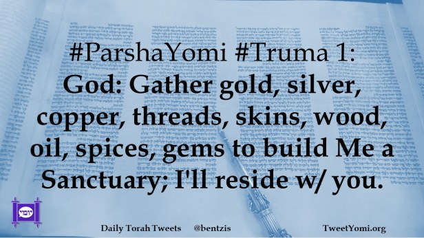 #ParshaYomi #Truma 1: God: Gather gold, silver, copper, threads, skins, wood, oil, spices, gems to build Me a Sanctuary; I’ll reside w/ you.