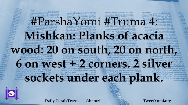 #ParshaYomi #Truma 4: Mishkan: Planks of acacia wood: 20 on south, 20 on north, 6 on west + 2 corners. 2 silver sockets under each plank.