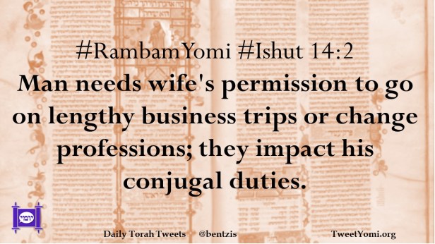 #RambamYomi #Ishut 14:2 Man needs wife’s permission to go on lengthy business trips or change professions; they impact his conjugal duties.