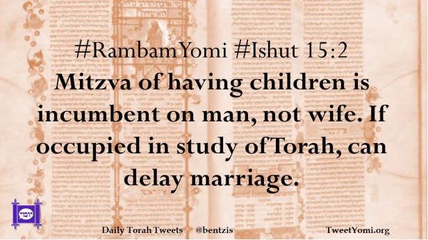 #RambamYomi #Ishut 15:2 Mitzva of having children is incumbent on man, not wife. If occupied in study of Torah, can delay marriage.