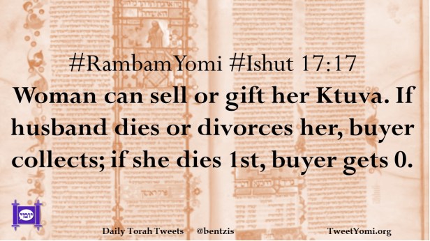 #RambamYomi #Ishut 17:17 Woman can sell or gift her Ktuva. If husband dies or divorces her, buyer collects; if she dies 1st, buyer gets 0.
