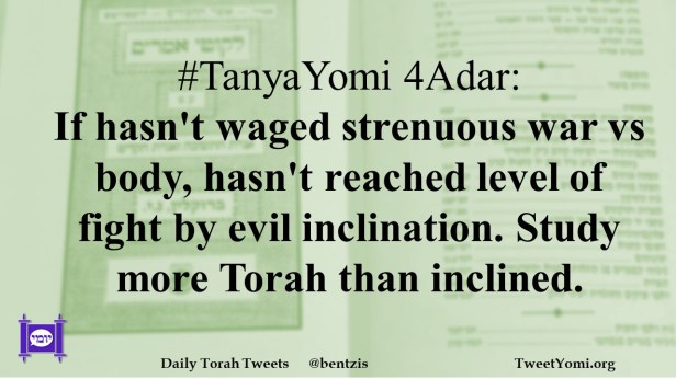 #TanyaYomi 4Adar: If hasn’t waged strenuous war vs body, hasn’t reached level of fight by evil inclination. Study more Torah than inclined.