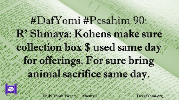 DafYomi, Pesahim #DafYomi #Pesahim 90 Date: April 21, 2021Author: ysspitz #DafYomi #Pesahim 90: R’ Shmaya: Kohens make sure collection box $ used same day for offerings. For sure bring animal sacrifice same day. Share this: Share on X (Opens in new window) X Share on Facebook (Opens in new window) Facebook Like Loading... Related