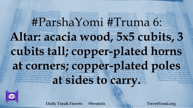 #ParshaYomi #Truma 6: Altar: acacia wood, 5×5 cubits, 3 cubits tall; copper-plated horns at corners; copper-plated poles at sides to carry.