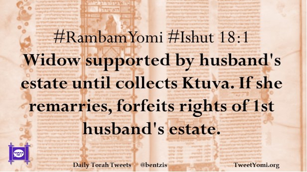 #RambamYomi #Ishut 18:1 Widow supported by husband’s estate until collects Ktuva. If she remarries, forfeits rights of 1st husband’s estate.