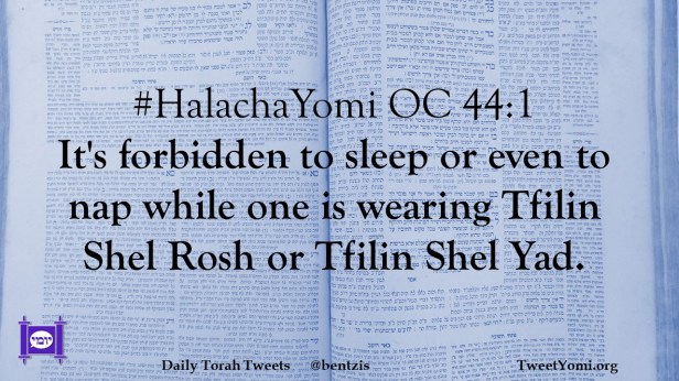 HalachaYomi #HalachaYomi OC 44:1 Date: April 28, 2021Author: ysspitz #HalachaYomi OC 44:1 It’s forbidden to sleep or even to nap while one is wearing Tfilin Shel Rosh or Tfilin Shel Yad. Share this: Share on X (Opens in new window) X Share on Facebook (Opens in new window) Facebook Like Loading... Related